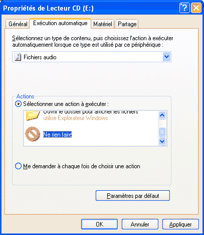 Vous pouvez également préciser dans la même boite de dialogue que lorsqu'un CD audio est inséré, il soit lu automatiquement. La fonction d'exécution automatique sera de nouveau activée. Après vous pouvez faire la même chose pour les fichiers image ou vidéo. |